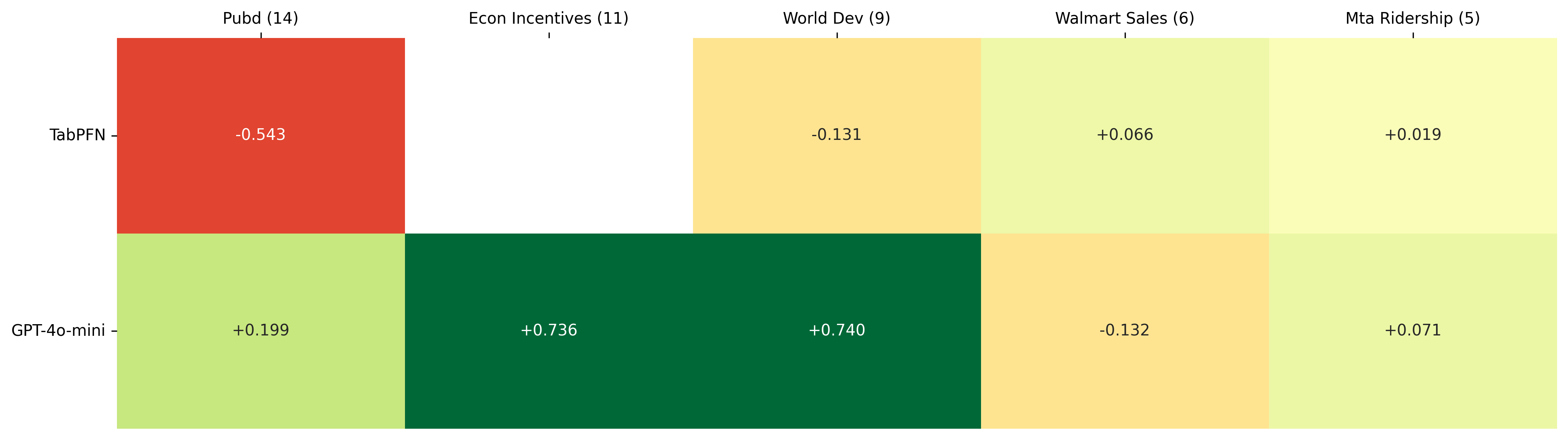 By removing irrelevant features, such as the 404 columns pruned from the World Development Indicators (WDI) dataset, we effectively reduced the input space, which in several cases appeared to improve the model's ability to focus on meaningful signals. Additionally, the Econ Incentives dataset was omitted from our initial baseline reporting for TabPFN because its original data structure did not fully fit TabPFN's context window constraints prior to the feature selection process. However, this boost was not observed uniformly across all datasets. As we will explore in the following statistical analysis, the high degree of variance in these results suggests that while pruning can mitigate numerical distraction in specific high-noise environments, it is not yet a guaranteed fix for regression accuracy.